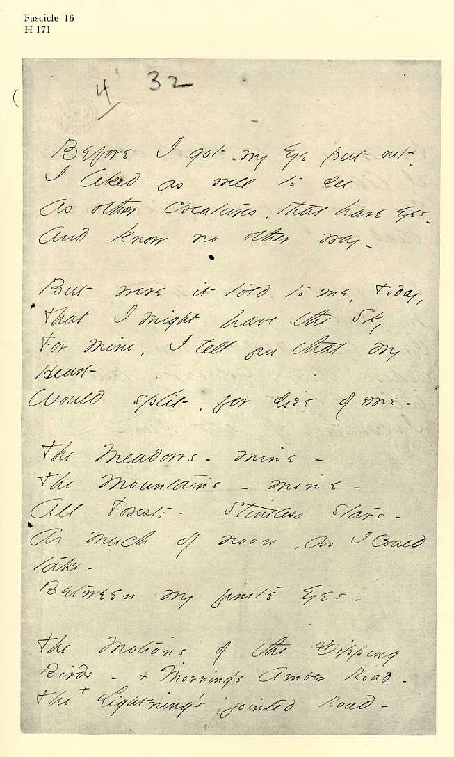 Before I got my eye put out I liked as well to see — As other Creatures, that have Eyes And know no other way — But were it told to me — Today — That I might have the sky For mine — I tell you that my Heart Would split, for size of me — The Meadows — mine — The Mountains — mine — All Forests — Stintless Stars — As much of Noon as I could take Between my finite eyes — The Motions of the Dipping Birds — The Morning's Amber Road — For mine — to look at when I liked — The News would strike me dead — So safer — guess — with just my soul Upon the Window pane — Where other Creatures put their eyes — Incautious — of the Sun —