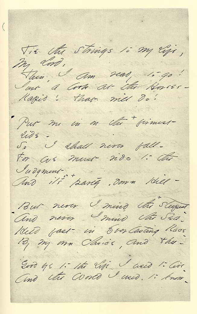 Tie the Strings to my Life, My Lord, Then, I am ready to go! Just a look at the Horses — Rapid! That will do! Put me in on the firmest side — So I shall never fall — For we must ride to the Judgment — And it's partly, down Hill — But never I mind the steeper — And never I mind the Sea — Held fast in Everlasting Race — By my own Choice, and Thee — Goodbye to the Life I used to live — And the World I used to know — And kiss the Hills, for me, just once — Then — I am ready to go!