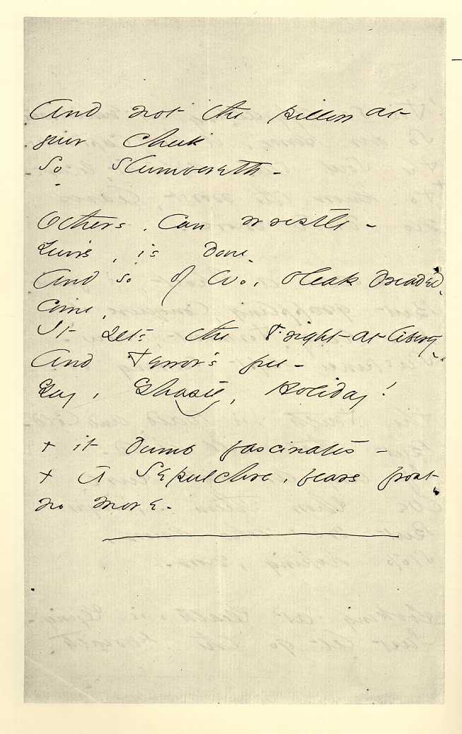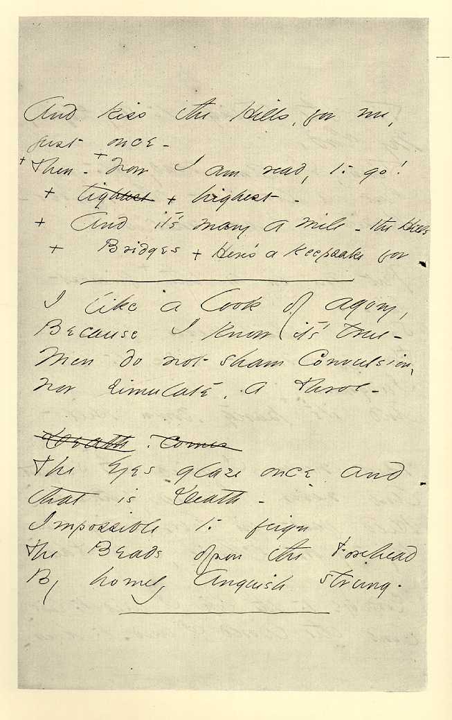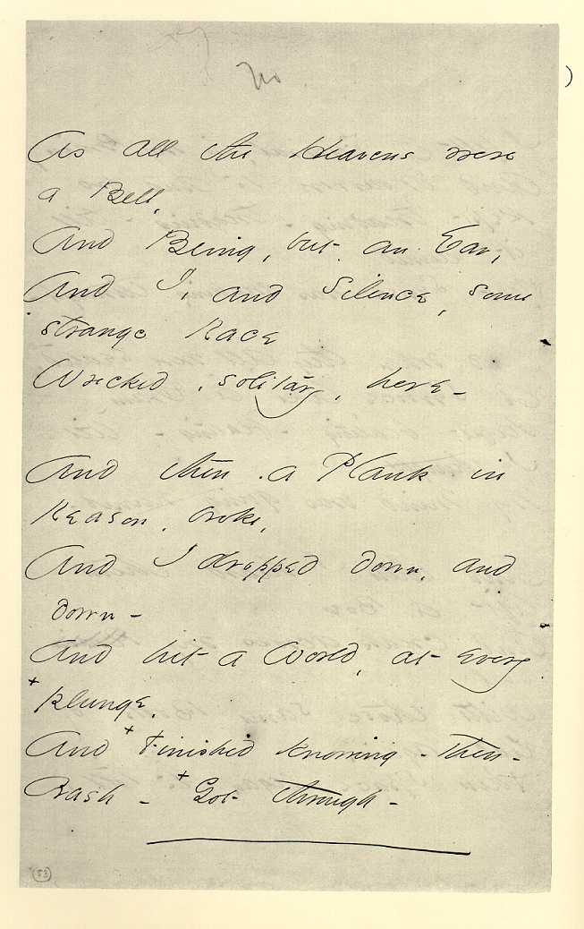'Tis so appalling — it exhilarates — So over Horror, it half Captivates — The Soul stares after it, secure — A Sepulchre, fears frost, no more — To scan a Ghost, is faint — But grappling, conquers it — How easy, Torment, now — Suspense kept sawing so — The Truth, is Bald, and Cold — But that will hold — If any are not sure — We show them — prayer — But we, who know, Stop hoping, now — Looking at Death, is Dying — Just let go the Breath — And not the pillow at your Cheek So Slumbereth — Others, Can wrestle — Yours, is done — And so of Woe, bleak dreaded — come, It sets the Fright at liberty — And Terror's free — Gay, Ghastly, Holiday!