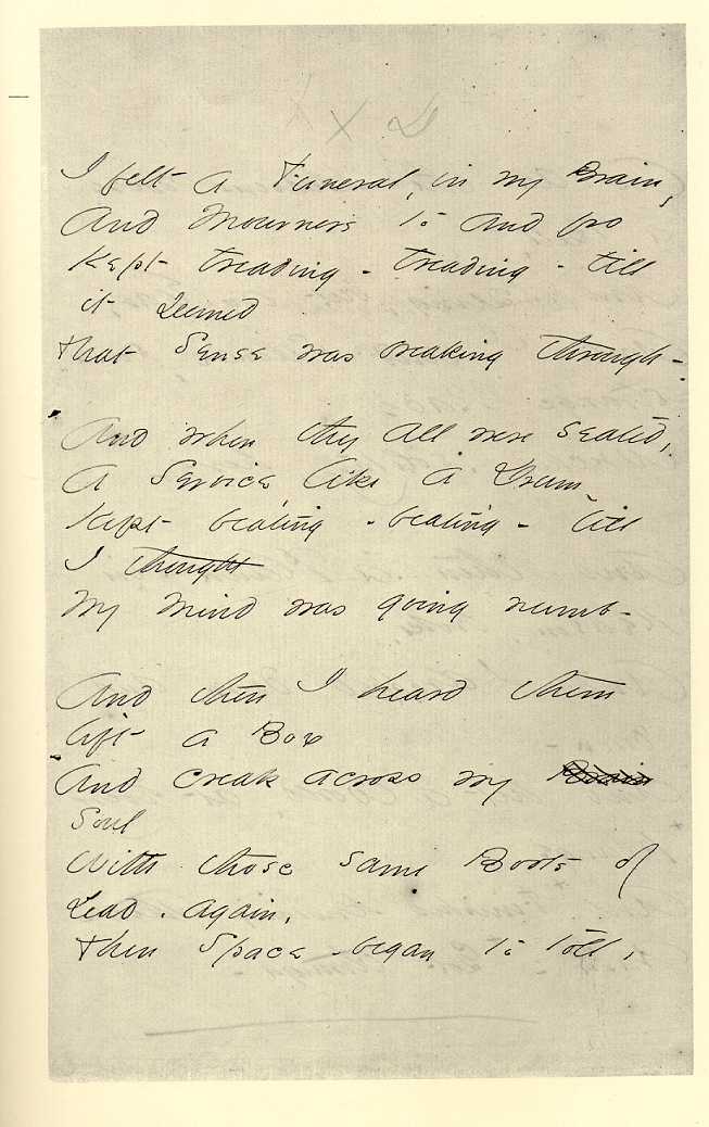 I felt a Funeral, in my Brain, And Mourners to and fro Kept treading — treading — till it seemed That Sense was breaking through — And when they all were seated, A Service, like a Drum — Kept beating — beating — till I thought My Mind was going numb — And then I heard them lift a Box And creak across my Soul With those same Boots of Lead, again, Then Space — began to toll, As all the Heavens were a Bell, And Being, but an Ear, And I, and Silence, some strange Race Wrecked, solitary, here — And then a Plank in Reason, broke, And I dropped down, and down — And hit a World, at every plunge, And Finished knowing — then —