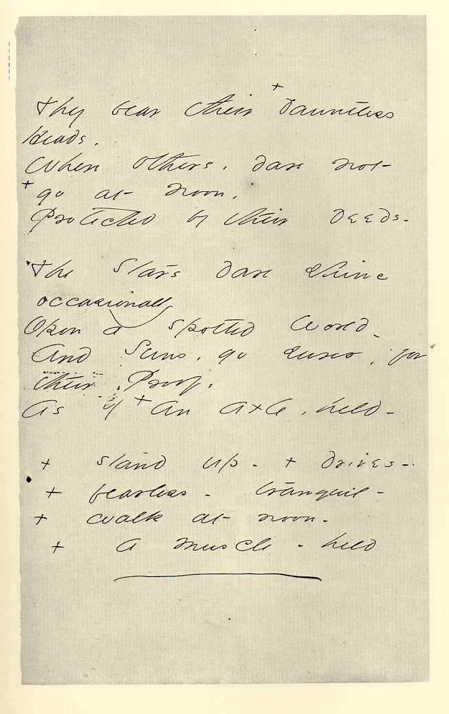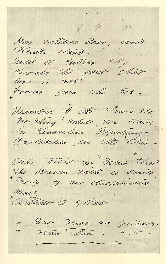 How noteless Men, and Pleiads, stand, Until a sudden sky Reveals the fact that One is rapt Forever from the Eye — Members of the Invisible, Existing, while we stare, In Leagueless Opportunity, O'ertakenless, as the Air — Why didn't we detain Them? The Heavens with a smile, Sweep by our disappointed Heads Without a syllable —