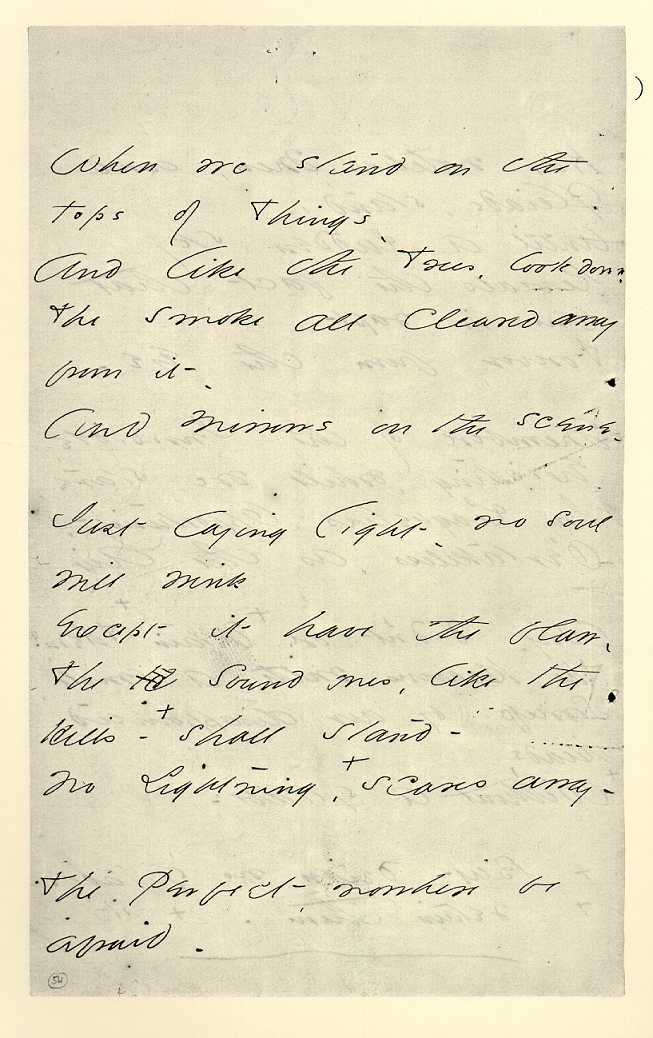 When we stand on the tops of Things — And like the Trees, look down — The smoke all cleared away from it — And Mirrors on the scene — Just laying light — no soul will wink Except it have the flaw — The Sound ones, like the Hills — shall stand — No Lighting, scares away — The Perfect, nowhere be afraid — They bear their dauntless Heads, Where others, dare not go at Noon, Protected by their deeds — The Stars dare shine occasionally Upon a spotted World — And Suns, go surer, for their Proof, As if an Axle, held —