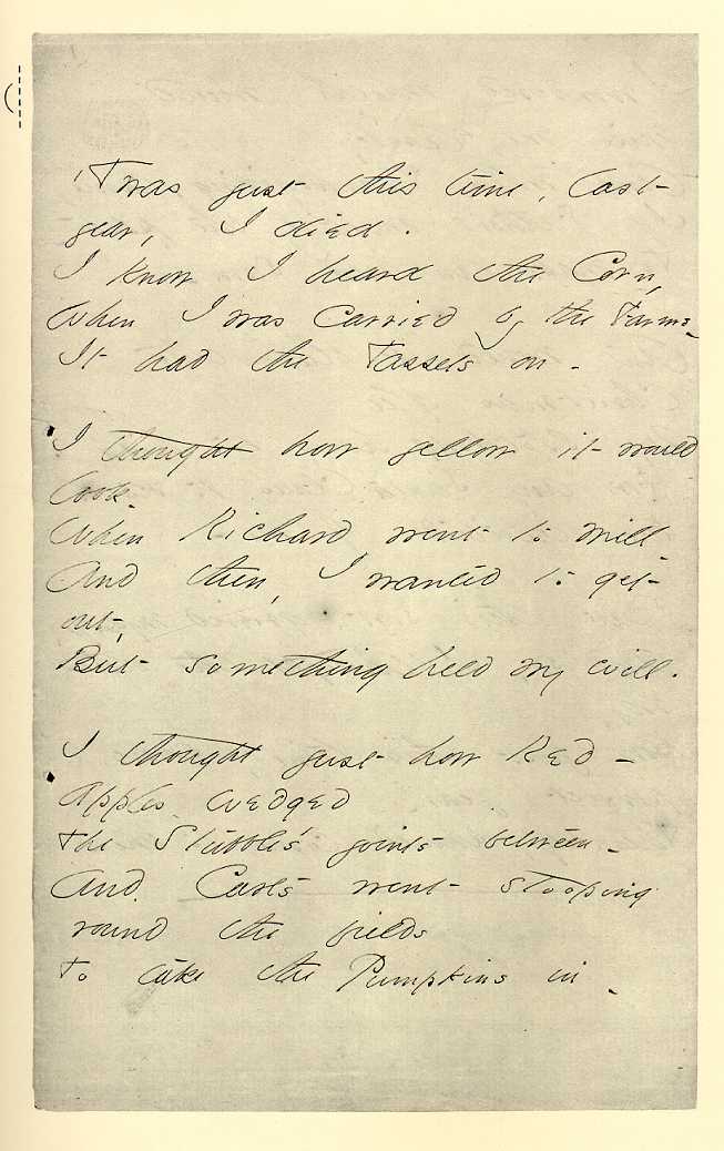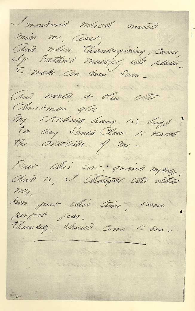 'Twas just this time, last year, I died. I know I heard the Corn, When I was carried by the Farms — It had the Tassels on — I thought how yellow it would look — When Richard went to mill — And then, I wanted to get out, But something held my will. I thought just how Red — Apples wedged The Stubble's joints between — And the Carts stooping round the fields To take the Pumpkins in — I wondered which would miss me, least, And when Thanksgiving, came, If Father'd multiply the plates — To make an even Sum — And would it blur the Christmas glee My Stocking hang too high For any Santa Claus to reach The Altitude of me — But this sort, grieved myself, And so, I thought the other way, How just this time, some perfect year — Themself, should come to me —