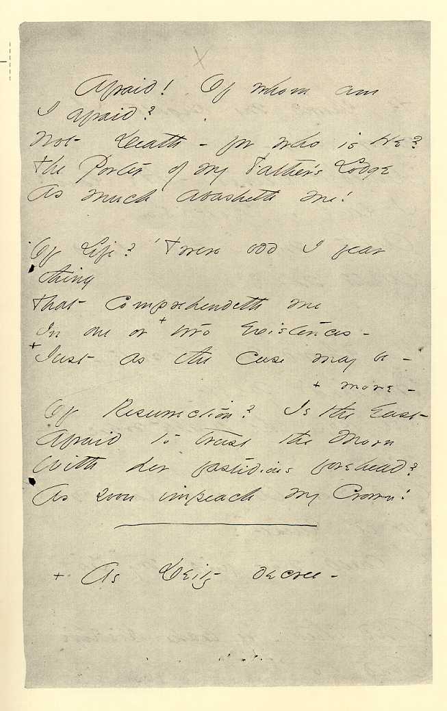 Afraid! Of whom am I afraid? Not Death — for who is He? The Porter of my Father's Lodge As much abasheth me! Of Life? 'Twere odd I fear [a] thing That comprehendeth me In one or two existences — As Deity decree — Of Resurrection? Is the East Afraid to trust the Morn With her fastidious forehead? As soon impeach my Crown!