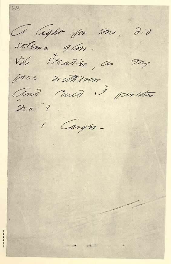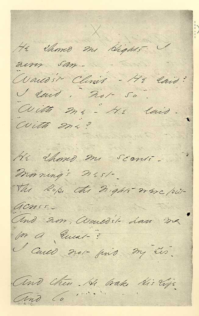 I showed her Heights she never saw — "Would'st Climb," I said? She said — "Not so" — "With me —" I said — With me? I showed her Secrets — Morning's Nest — The Rope the Nights were put across — And now — "Would'st have me for a Guest?" She could not find her Yes — And then, I brake my life — And Lo, A Light, for her, did solemn glow, The larger, as her face withdrew — And could she, further, "No"?