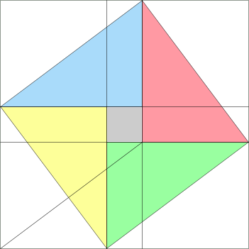 All of the coloured areas in (c) make up the square of the hypotenuse. To prove that together they’re the same area as the red and orange squares, the squares of the legs, think about how you can rearrange them, as in (d). You can see that they all fit together snugly in the square of the long leg, but to do so they have to overlap, and the size of the overlap is the square of the short leg.