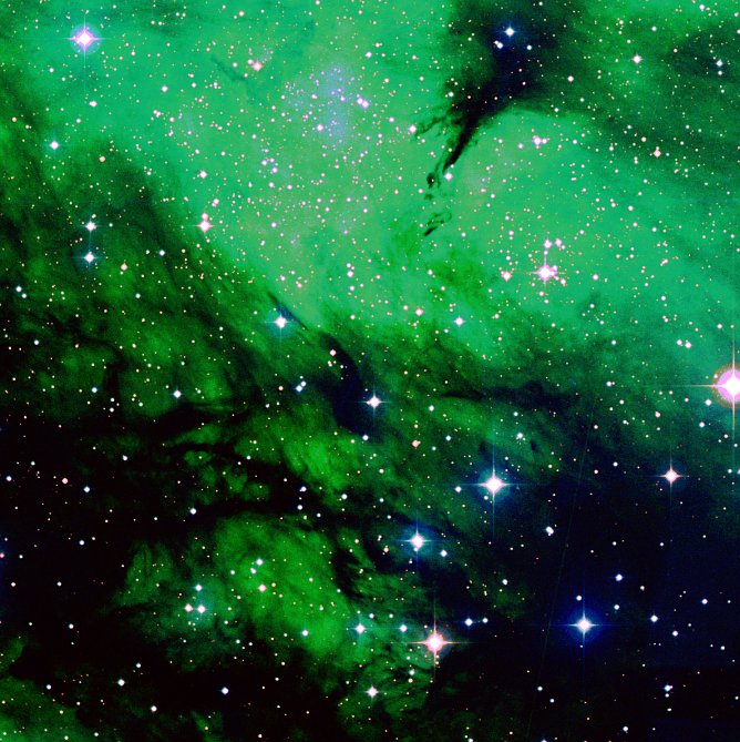 In actual fact it was the right spot, but Douglas had enhanced the view of the area. I wondered if I could do the same, so I grabbed some data from the DSS form that I found in looking for LBN 337 on my first day of using Google Sky, and got three POSS2 channels for it: blue, red, and infrared. Doug had used SDSS data and different channels, but I was unable to find that data, so I had to use POSS2, which was passable.